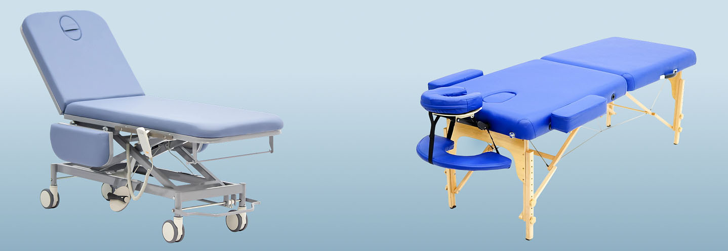 - Массажные — здесь также есть подголовник с регулировкой по высоте, в нем, как правило, предусмотрен вырез для лица, обеспечивающий комфорт при расположении пациента на животе, часто комплектуются подушками и валиками. Поскольку при проведении массажа на кушетку давит вес не только пациента (клиента), но и массажиста, такие модели рассчитаны на более значимые нагрузки.
