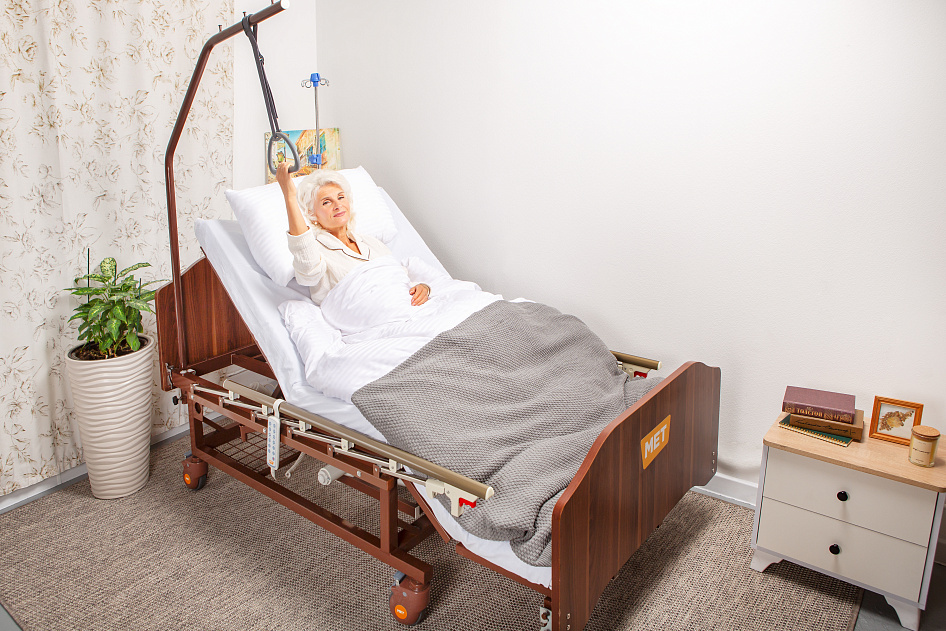 - Функциональные кровати — регулировка положения головной секции позволяет человеку принимать пищу в более комфортной позе, читать или смотреть кино, при наличии боковых «ушек» у этой секции поворачивать пациента на бок можно без боязни, что он упадет. Если опускается ножная секция, человек может фактически принимать положение сидя или полусидя. Туалетное устройство упрощает решение вопроса естественных потребностей. Могут быть и другие опции — например, опускающиеся боковые бортики, регулировка высоты ложа, колеса и др. Если есть электропривод, то при сохранном интеллекте и подвижности рук больной может сам регулировать положение секций. Лучше обсудить с лечащим врачом, что для конкретного пациента особенно важно, чтобы выбрать подходящую модель.