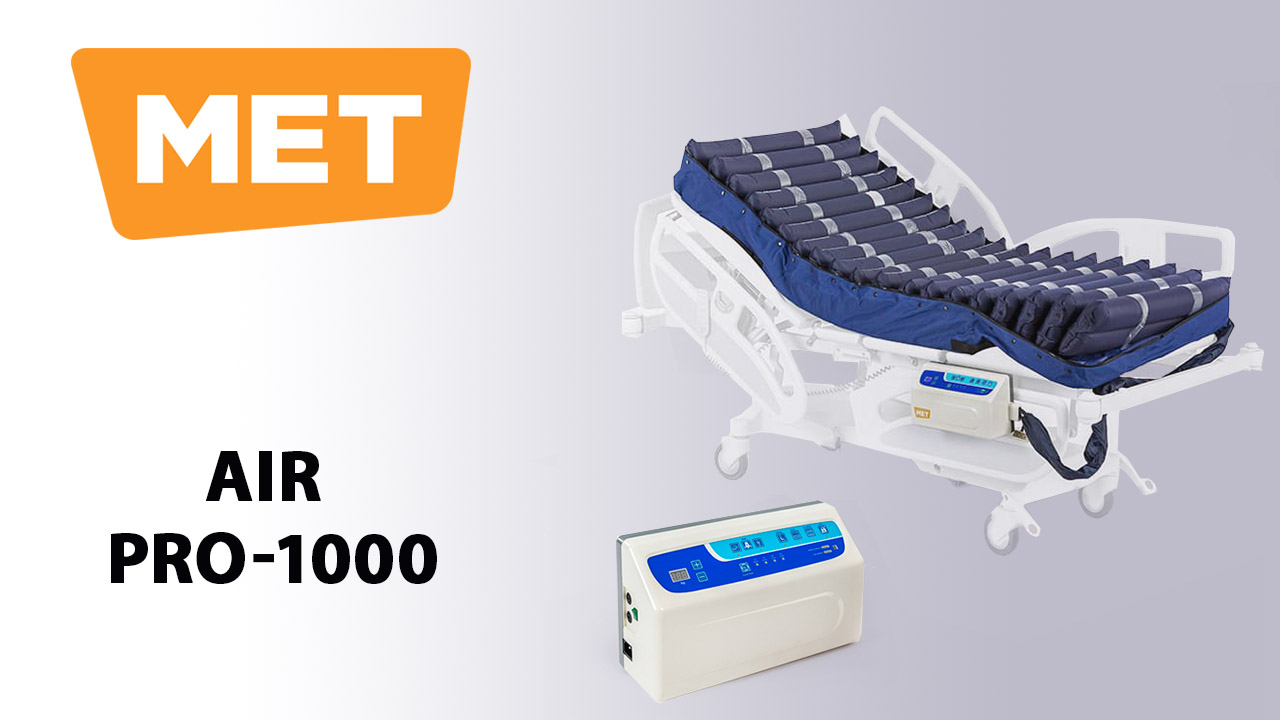 Противопролежневая система переменного давления MET AIR PRO-1000 разработана для лечения и профилактики пролежней средней тяжести, вызванных длительным постельным режимом. Матрас состоит из 19 воздушных камер индивидуально заполненных воздухом. Камеры поочередно надуваются и сдуваются при помощи компрессора, удерживая таким образом вес на определенных участках тела и позволяя кровотоку достигать различных участков тела обездвиженных или ослабленных пациентов.