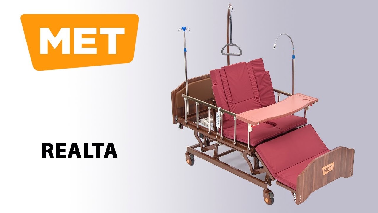 Функциональная кровать с электроприводом, электрифицированной функцией переворачивания и туалетным устройством. Головная секция имеет "ушки", что позволяет больному отдыхать и спать в сидячем положении.