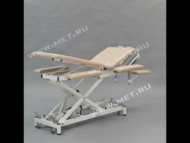 Массажный стол с электроприводным подъёмом ножной секции для флебологических и лимфодренажных процедур, и электрифицированной регулировкой высоты всего ложа. Стол оснащён поднимающимся изголовьем c подголовником оборудованным лицевым вырезом, расширителями ложа и регулируемыми по высоте подлокотниками.